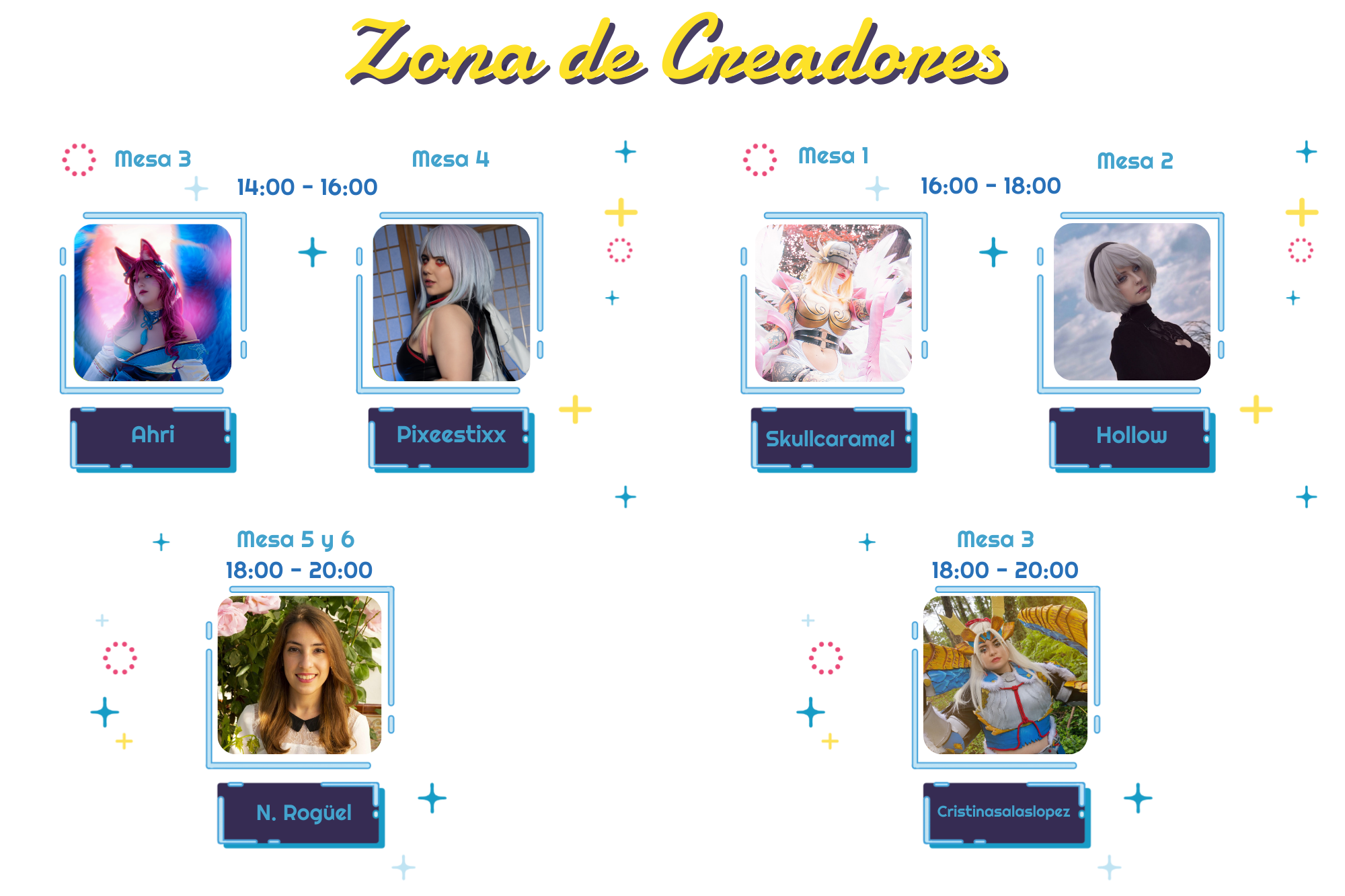 Horario de Firmas- Invitados y Zona de creadores ¡Próximamente! Invitados - Sábado (10:00-20:00) 10:0011:0012:0013:0014:0015:0016:0017:0018:0019:0020:00 Sainttufa Sainttufa Firmas Sainttufa 10:00 - 14:00 Firmas Sainttufa 17:00 - 20:00 Gaizka Soria Gaizka Soria Firmas Gaizka Soria Dhialgo Dhialgo Firmas Dhialgo 11:00 - 13:00 Ainari Ainari Firmas Ainari 11:00 - 13:00 Invitados - Sábado (10:00-20:00) Sainttufa Firmas Sainttufa 10:00 - 14:00 Firmas Sainttufa 17:00 - 20:00 Gaizka Soria Firmas Gaizka Soria 18:00 - 19:00 Dhialgo Firmas Dhialgo 11:00 - 13:00 Ainari Firmas Ainari 11:00 - 13:00